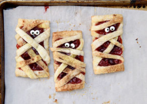 Place 2 or 3 tablespoons of pie filling in the centre of each rectangle, and spread it out to the perimeter, stopping 1/2 inch shy of the edge on all sides. Next, brush a little water on the bare edges to make them tacky. Place the “bandages” sugar-side up in a haphazard pattern atop the pie filling (see image). Trim the edges with the pizza roller, and place in the preheated oven for 15 to 20 minutes or until golden brown and puffy. Transfer the mummies to a cooling rack, and decorate them with candy eyes.